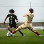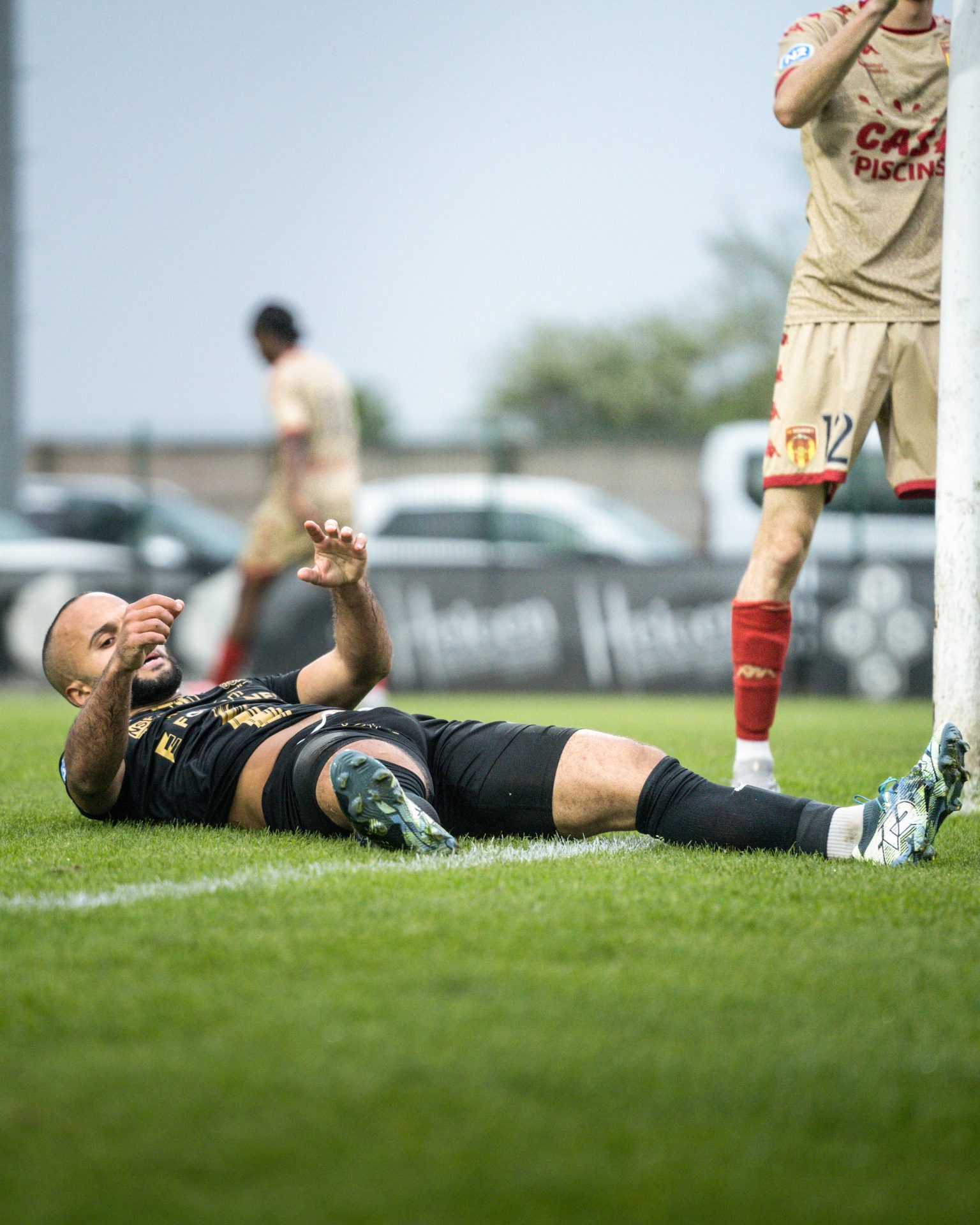 Après une récupération haute d’Ayoub Meftahi, le ballon est rapidement joué vers Mamadou Diallo. L’action se poursuit et revient sur Manny Allegret à l’entrée de la surface. L’attaquant contrôle, se met sur son pied et déclenche une frappe vicieuse, rasante, rendue encore plus difficile à lire par les rebonds sur la pelouse humide. Le portier de Rousset est piégé et commet une faute de main.
